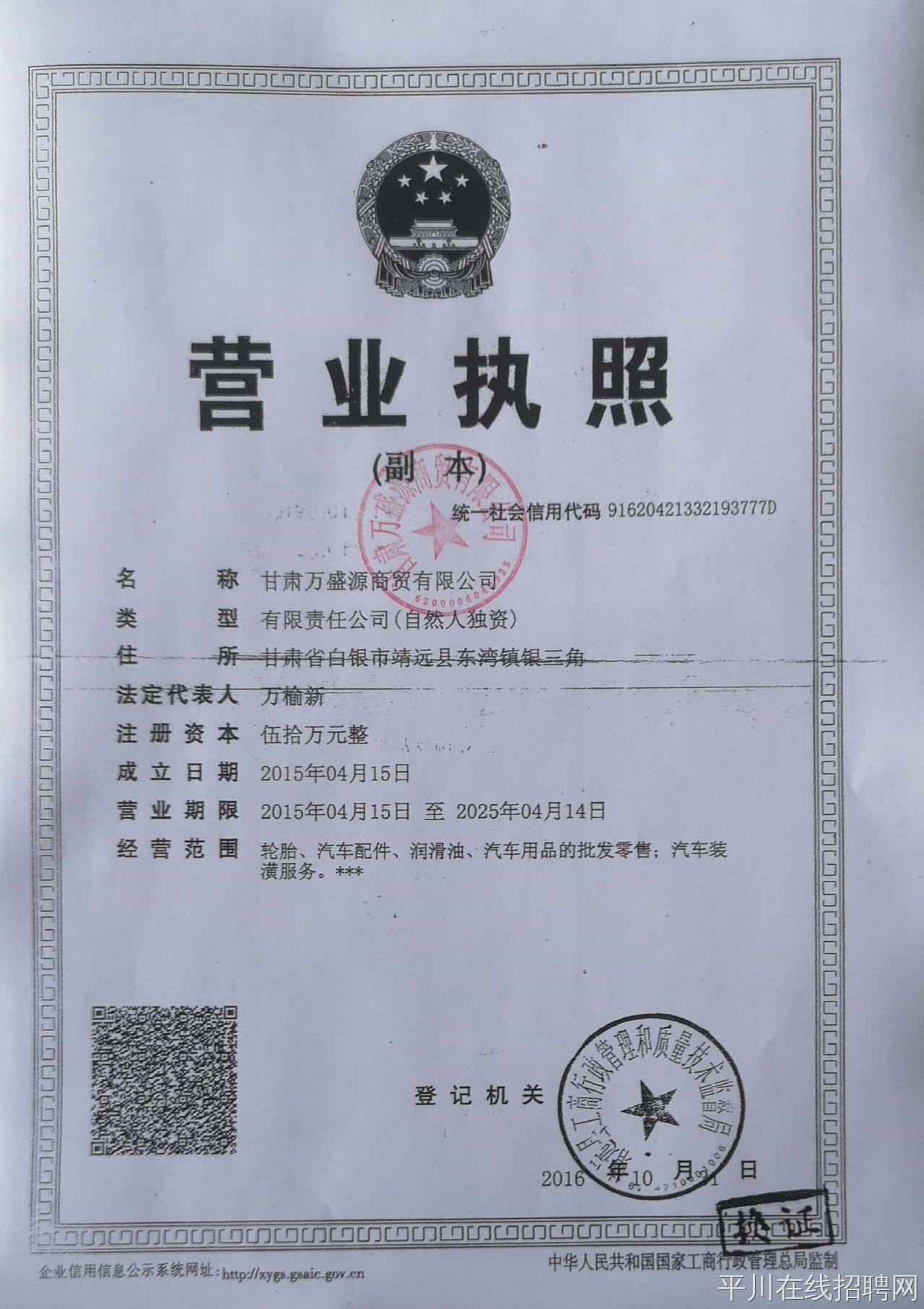 甘肃万盛源商贸有限公司 企业认证 实名认证